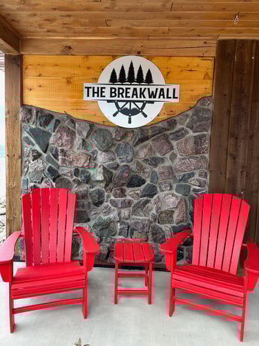 On the outside of the building you will notice numerous large rocks and stone. Tim used the rubble, left over from the construction of the breakwall in the bay, to enhance the look of the outside. The Breakwall is a solid and cozy space with an incredible view. The materials used reflect the combination of land and lake that makes our town so special. We are excited to be able to share it with you.